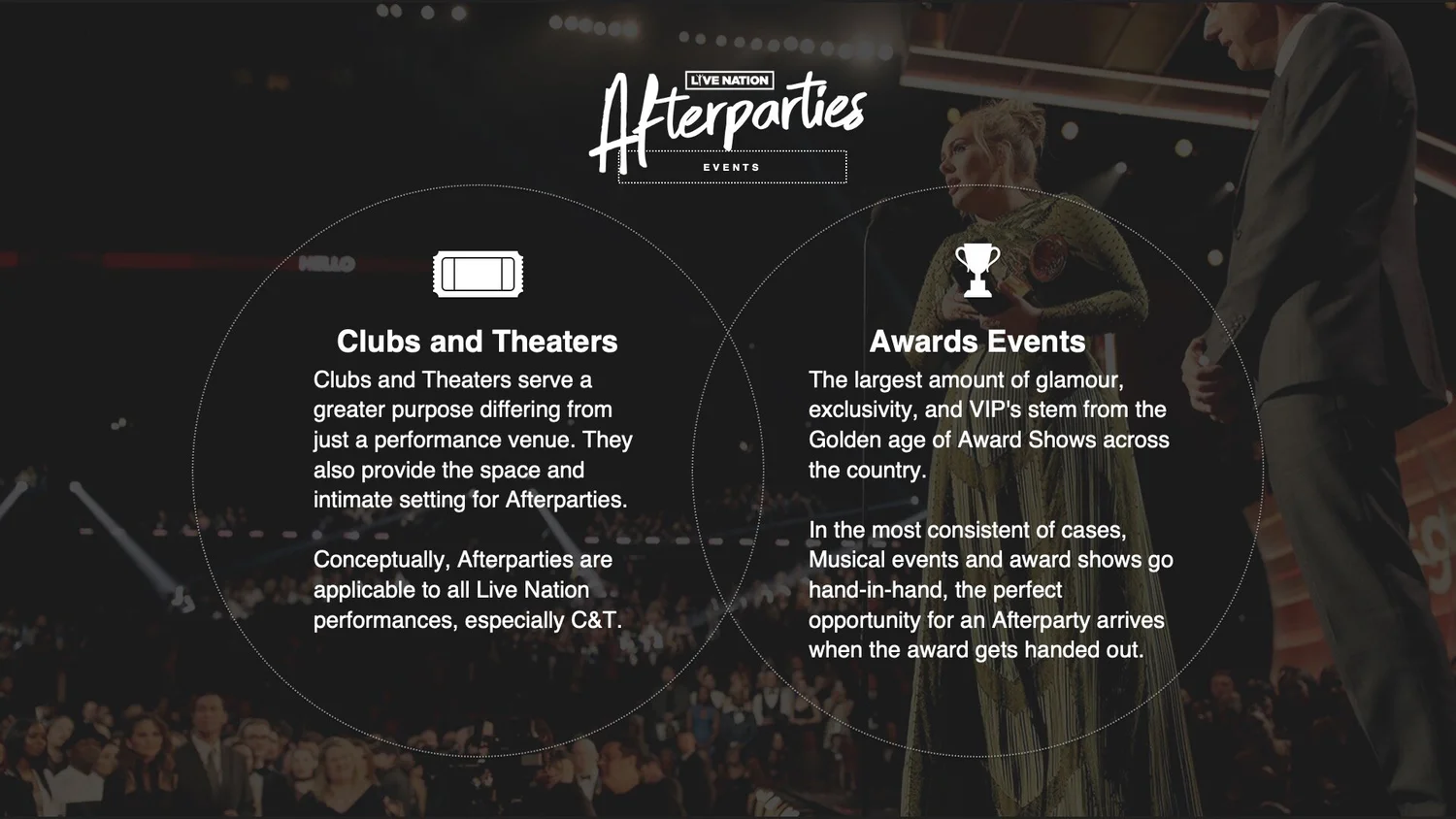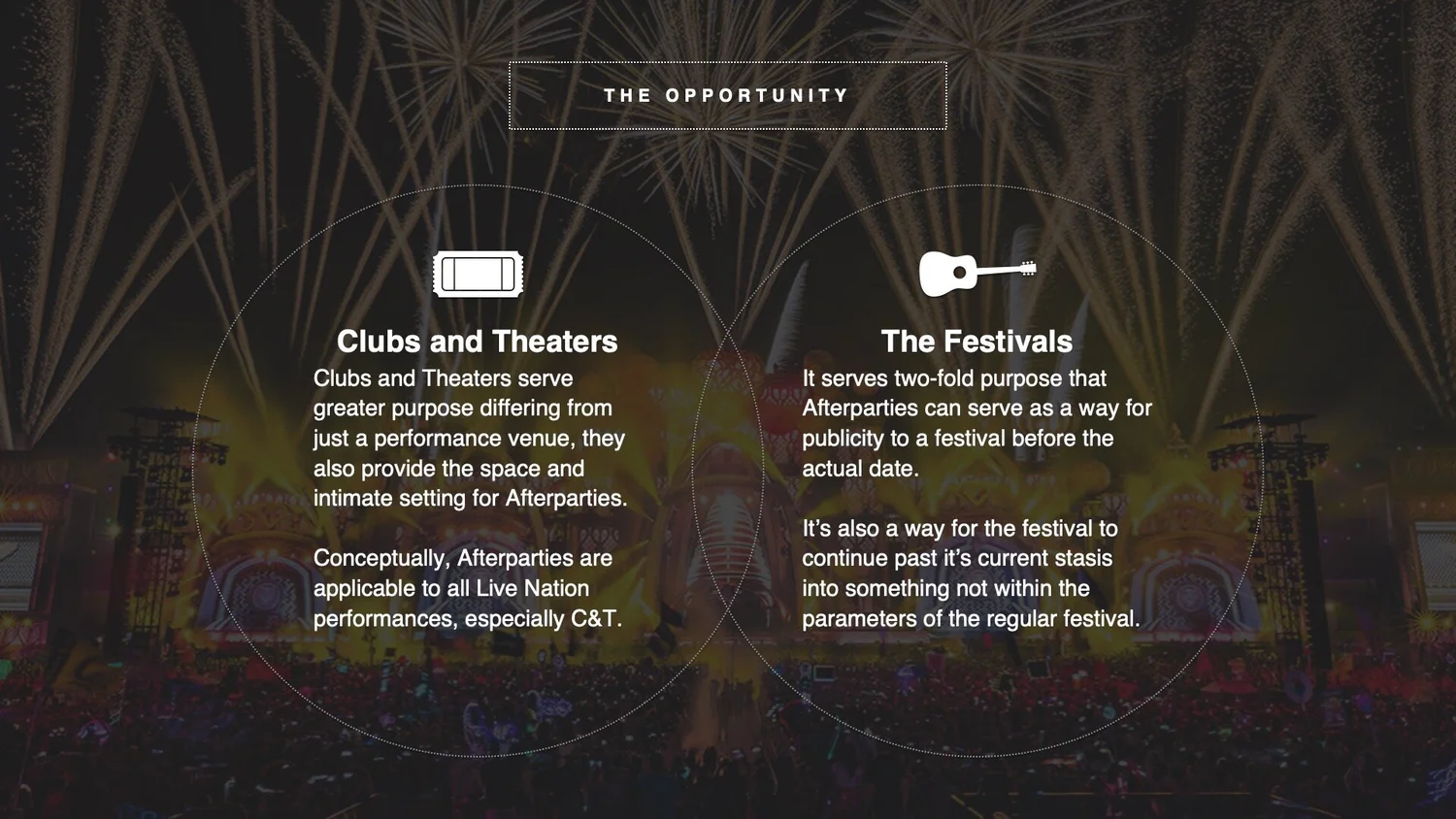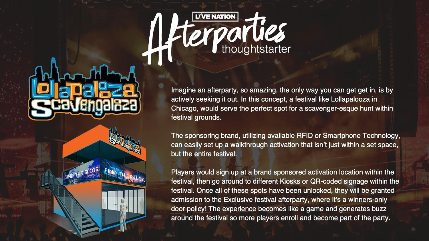 The brief below was to create shareable, social moment filled experiences featuring Live Nation talent, artists and venues. These experiences would be connected to external events in a third-party format. Examples include the Super Bowl and The Grammy Awards. This would specifically leverage Live Nation’s extensive line up of Clubs, Theaters and even Music Festivals to allow music fans the ultimate afterparty to capitalize on the engagements created from these already global events. Though some are intimate in nature, this would provide a unique setting for the most social of fans to capture their experience and share it with the world.