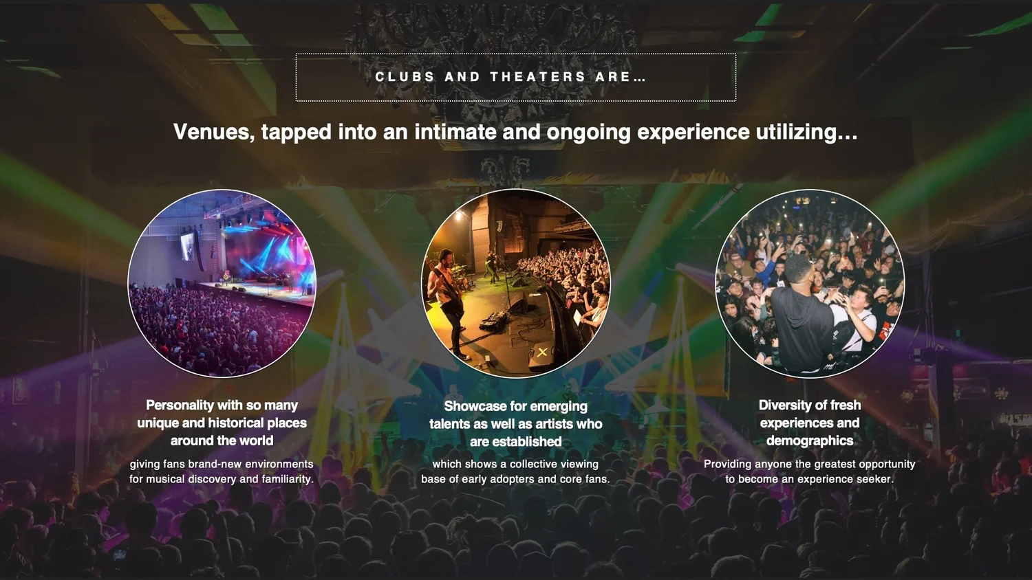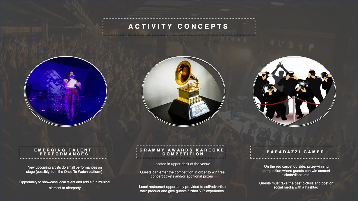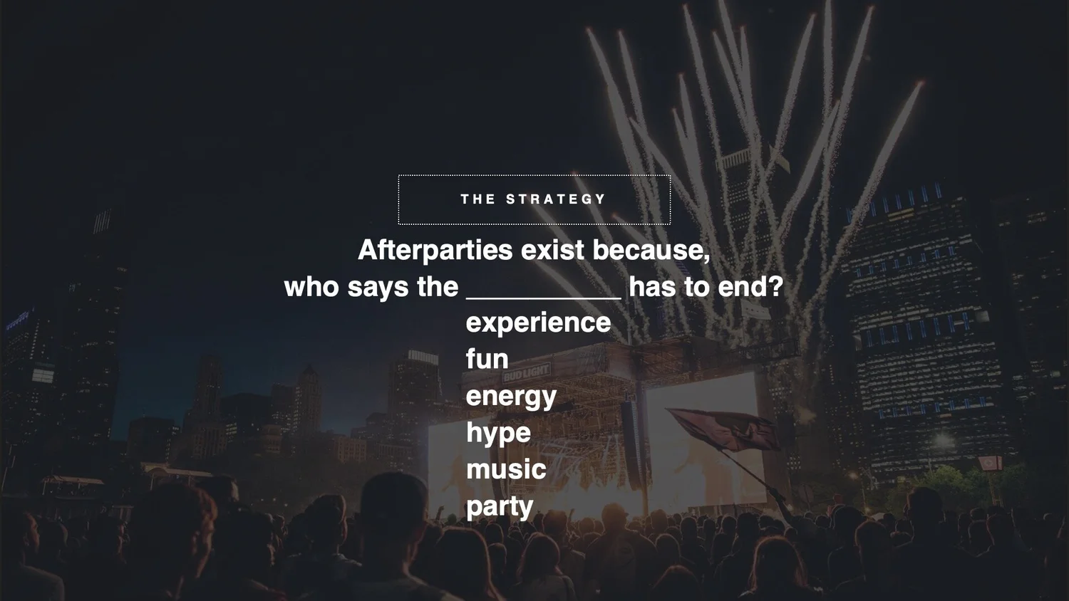 The brief below was to create shareable, social moment filled experiences featuring Live Nation talent, artists and venues. These experiences would be connected to external events in a third-party format. Examples include the Super Bowl and The Grammy Awards. This would specifically leverage Live Nation’s extensive line up of Clubs, Theaters and even Music Festivals to allow music fans the ultimate afterparty to capitalize on the engagements created from these already global events. Though some are intimate in nature, this would provide a unique setting for the most social of fans to capture their experience and share it with the world.