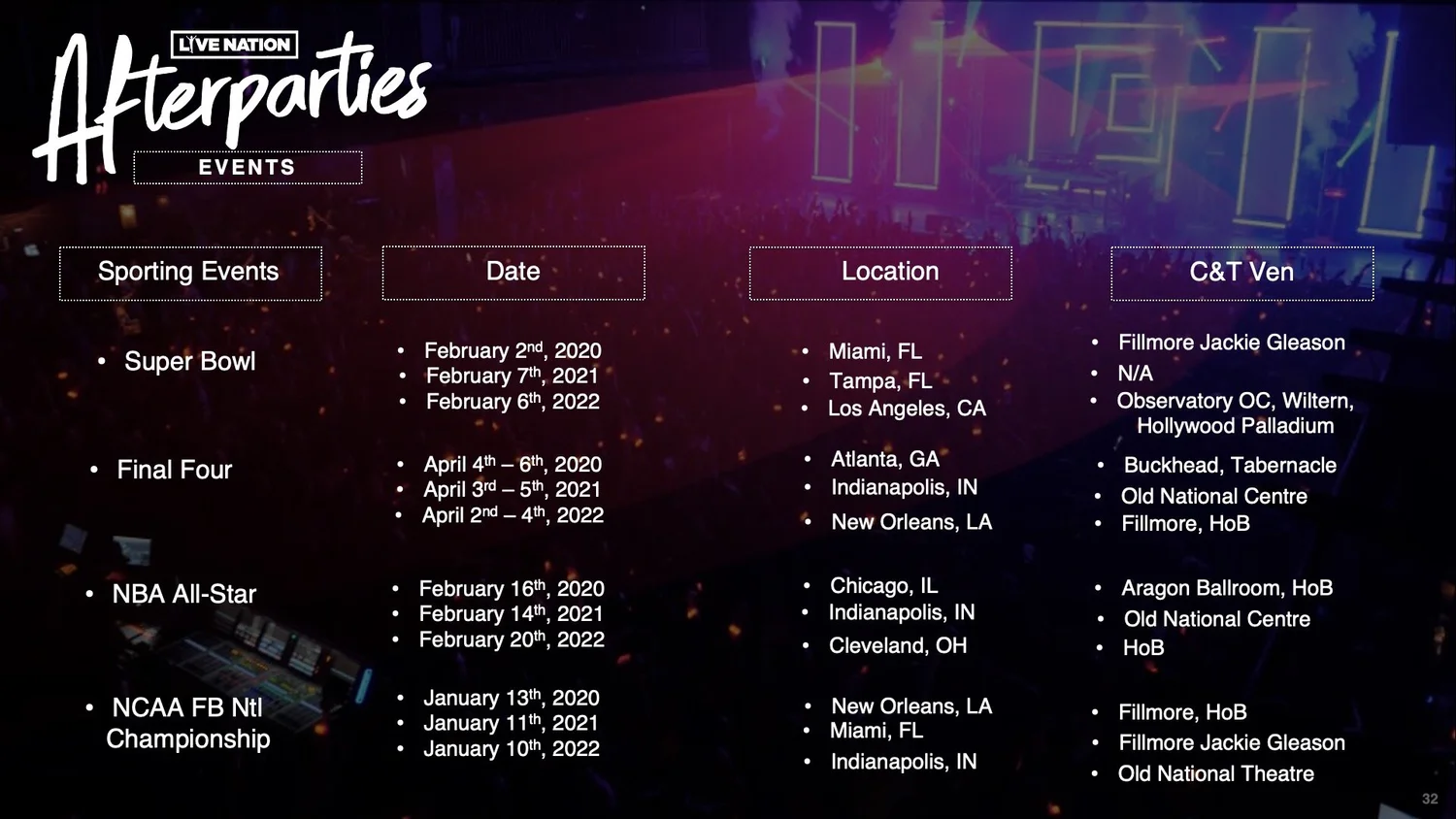 One foundational experience to my love of events was my time as a Media & Sponsorship Intern for the largest music promoter in the world, Live Nation Entertainment. This Internship was in Summer of 2019, and I’m tremendously grateful for the wonderful team and experience I gained through this special opportunity. Below you can find my keystone intern project I worked on in my time with the Live Nation Sponsorship Team, centering around my main project of After-party styled events and performances. In addition to this deck, I was able to provide on site support at various clubs, theaters and festivals as I assisted in overall sponsorship integrations at these venues, reviewing asset installations and the execution of specialty activations for Influencers, VIPs and Talent,